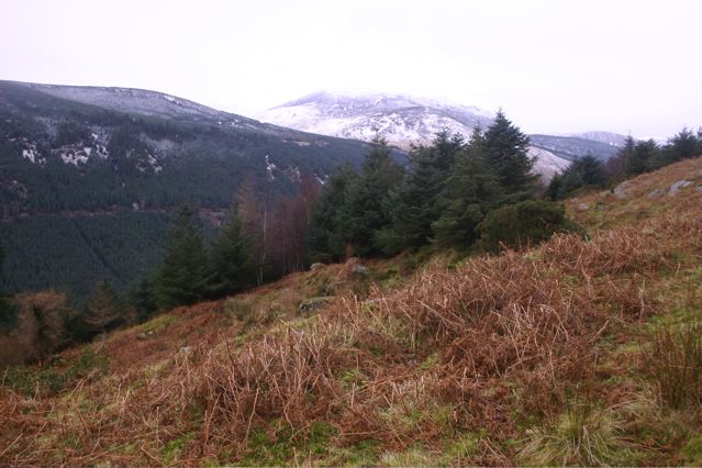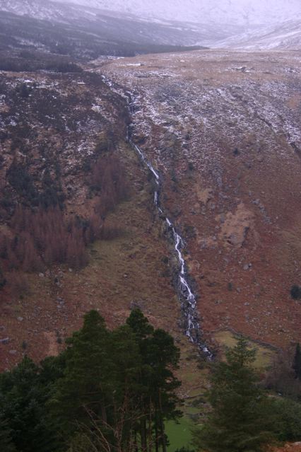 The weekend was cold, with light snows, rain, and ferocious winds at times. But we had a fireplace and plenty of fuel. At times the weather cleared enough for walks. One very delightful one was at Glenmalure, the longest glacial valley in Ireland and UK. It’s just east of Luqnaquilla, Wicklow’s highest mountain at 925m. There’s also the impressive Carrawaystick waterfall, down to the Avonbeg River (see left).