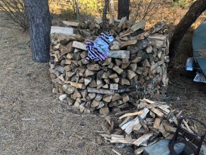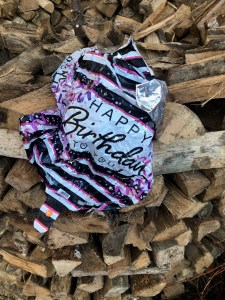 A balloon of unknown origin appeared in our yard this week. It was first stuck in a maple tree, but later ended up on our woodpile.