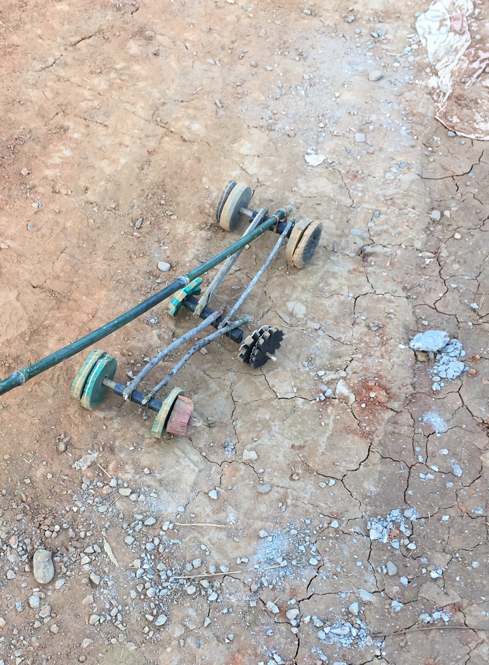 Jenish showed me his car. It’s 16 inches long. There are wooden wheels, six of them, much like an extra-terrestrial rover might have. That’s useful for the rough street it has to navigate.